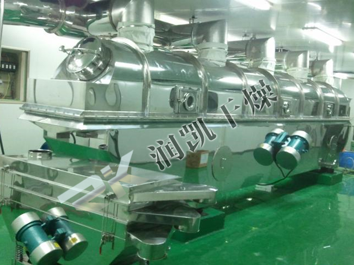 物料自進(jìn)料口進(jìn)入機(jī)內(nèi), 在振動(dòng)力作用下, 物料沿水平方向拋擲向前連續(xù)運(yùn)動(dòng),熱風(fēng)向上穿過(guò)流化床同濕料換熱后, 濕空氣經(jīng)旋風(fēng)分離器除塵后由排風(fēng)口排出, 干燥物料由排料口排出。