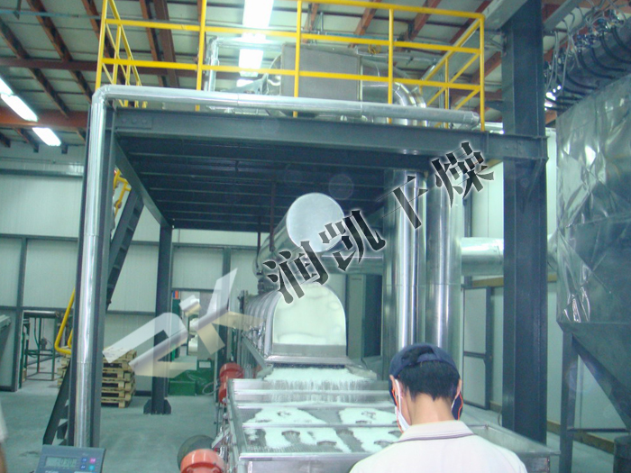 ③由于施加振動(dòng),可使最小流化氣速降低,因而可顯著降低空氣需求量,進(jìn)而降低粉塵層夾帶,配套熱源,風(fēng)機(jī),旋風(fēng)分離器等也可相應(yīng)縮小規(guī)格,成套設(shè)備降低,節(jié)能效果明顯??煞奖愕匾揽空{(diào)整振動(dòng)參數(shù)來(lái)改變?cè)跈C(jī)內(nèi)滯留時(shí)間。其活塞流式的運(yùn)行降低了物料粒度均勻性及規(guī)則性要求,易于獲得均勻的干燥產(chǎn)品。